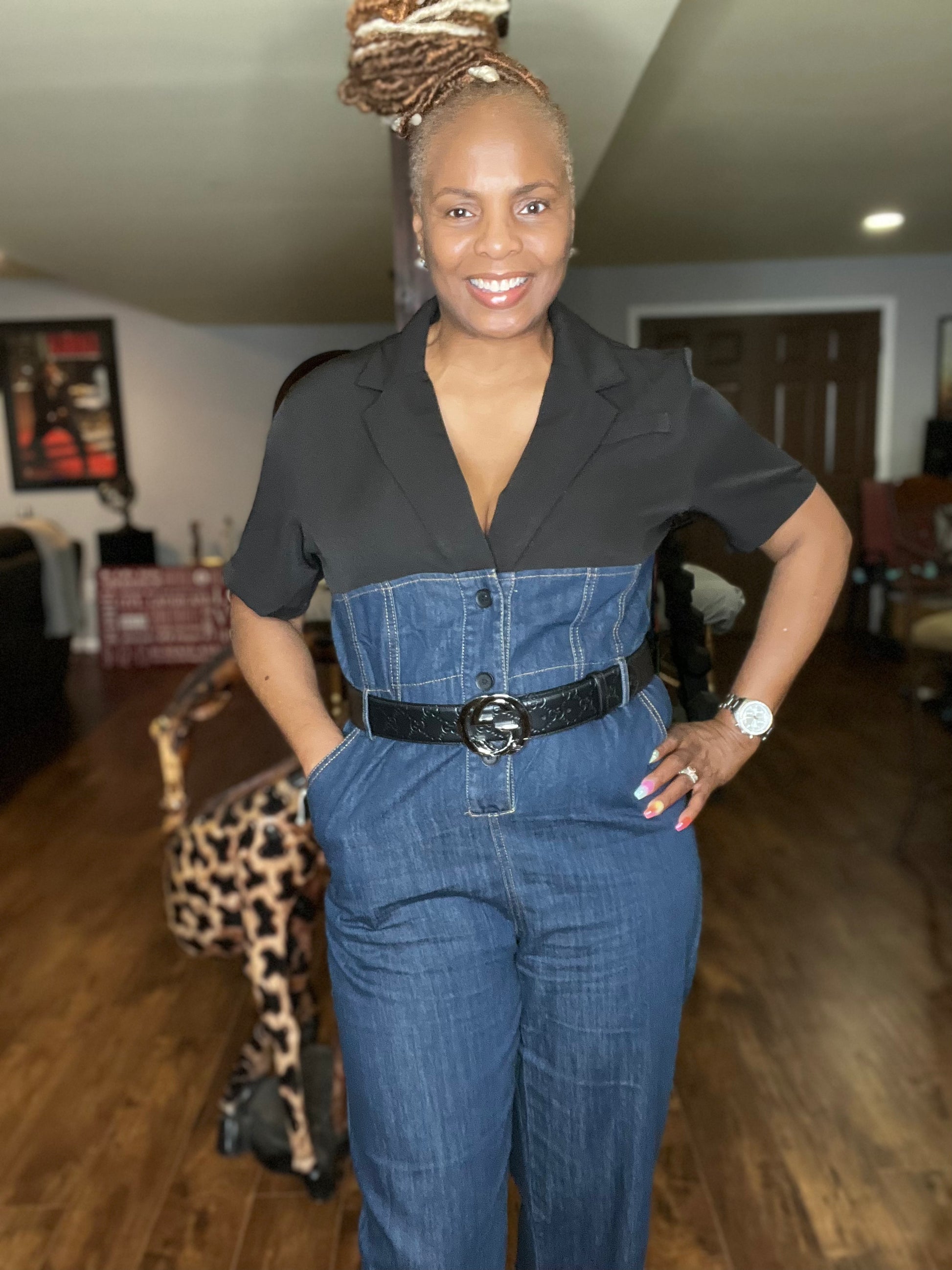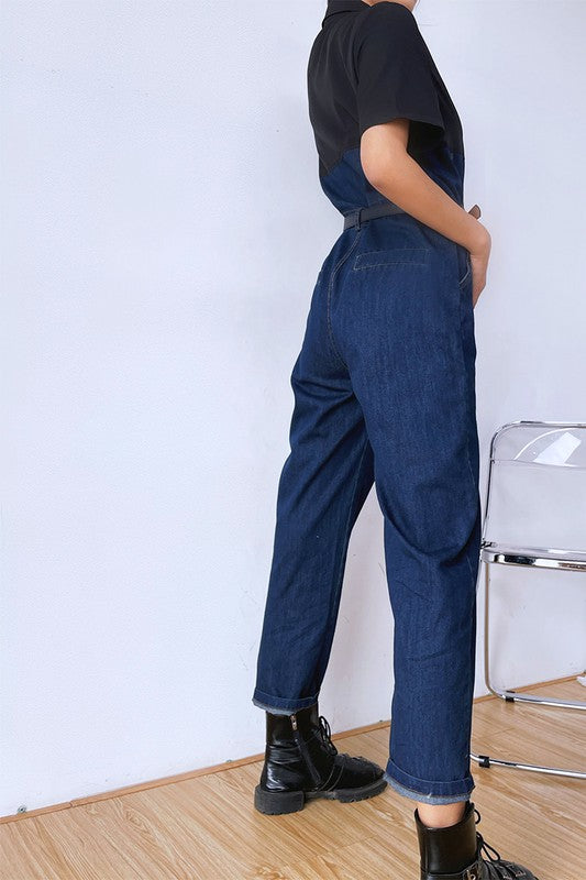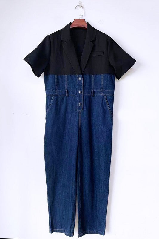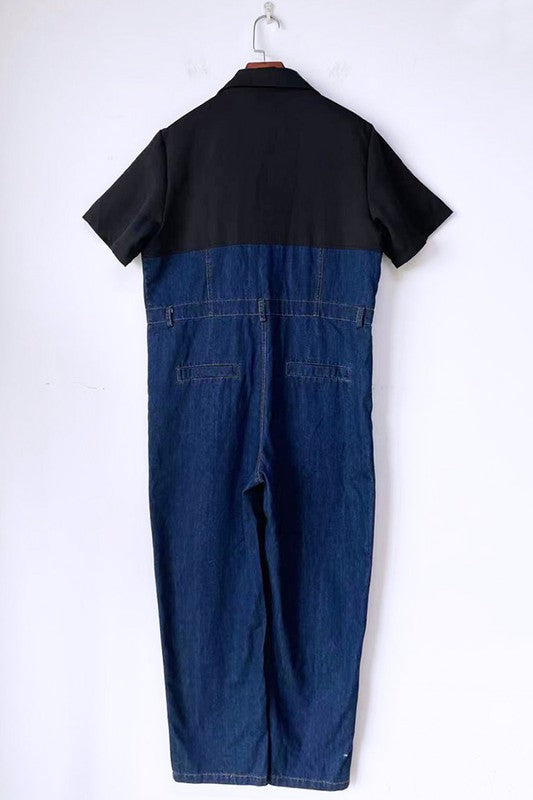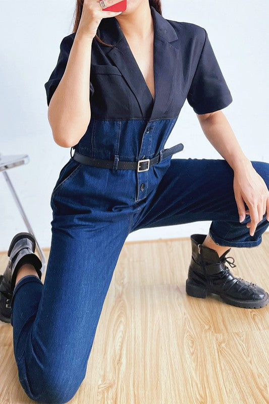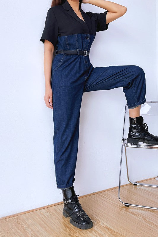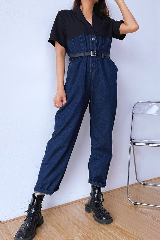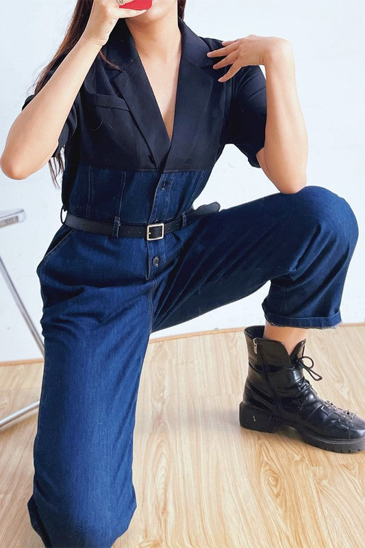 Short sleeve v-neck button down denim jumpsuit. Belt not included
