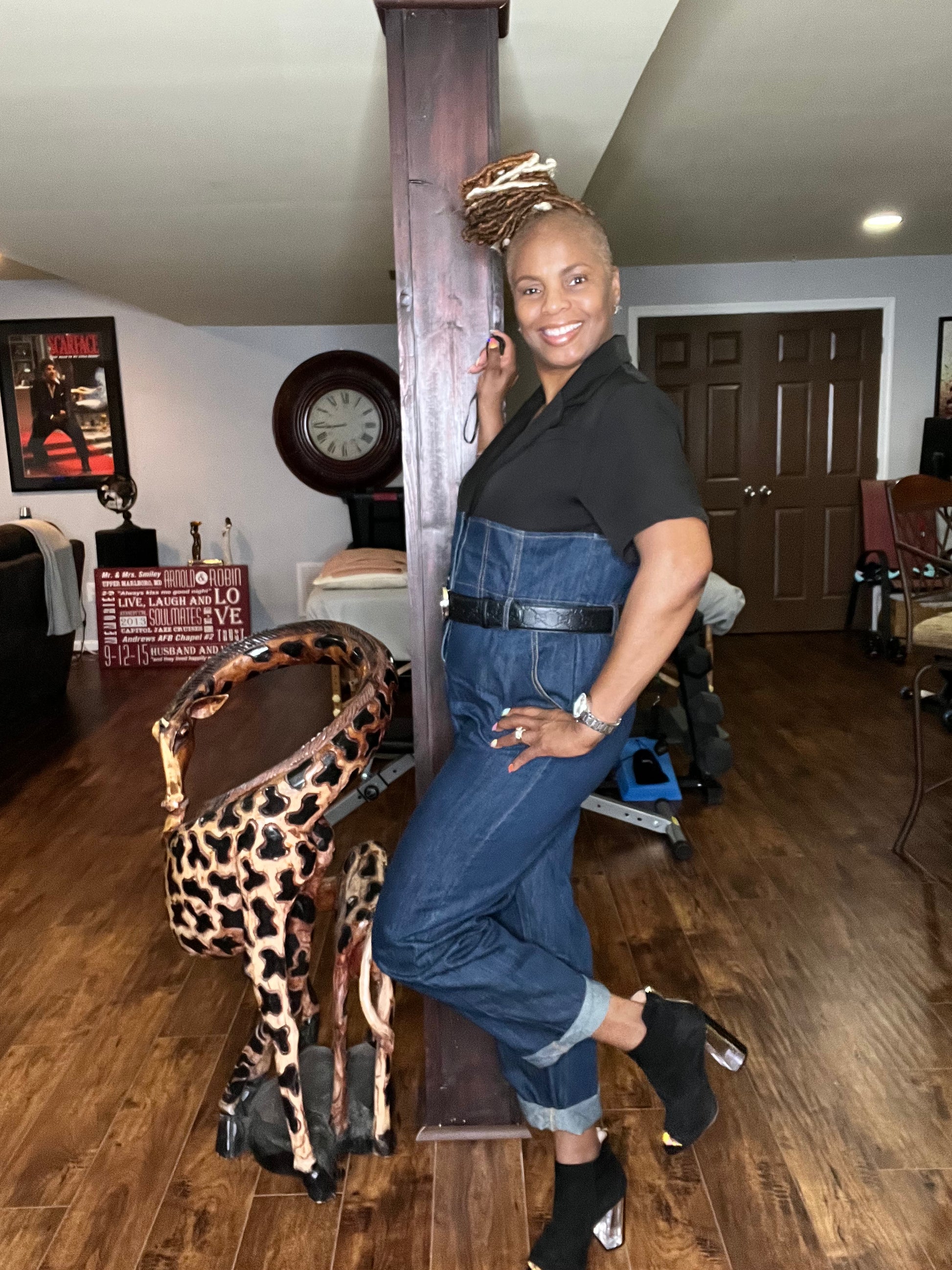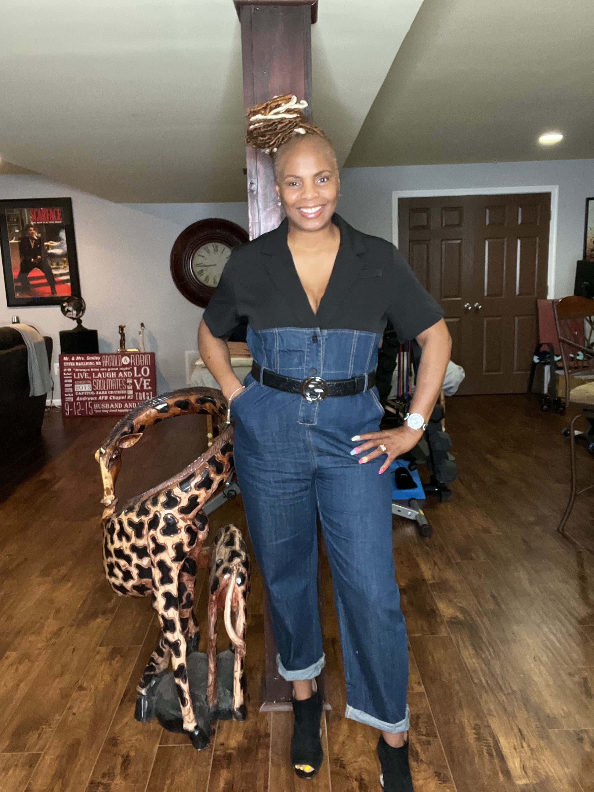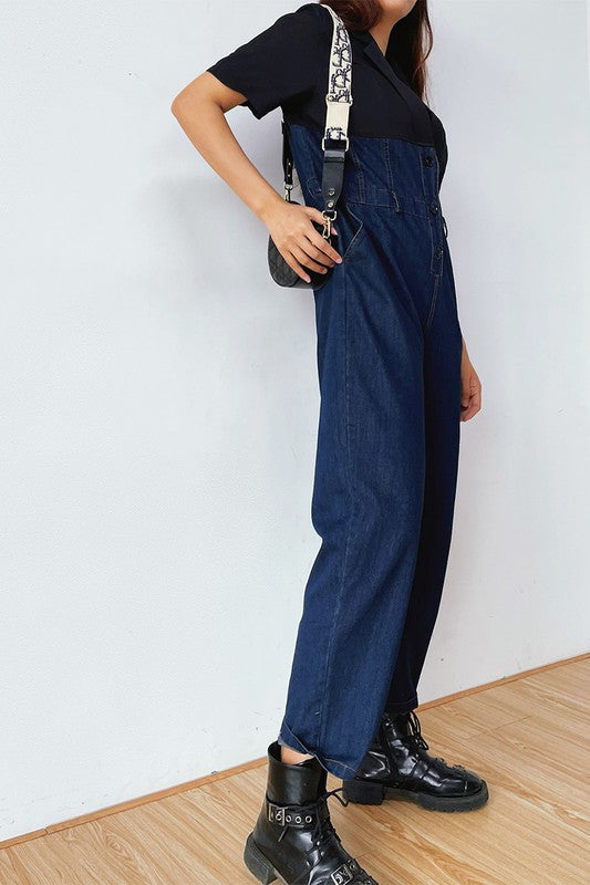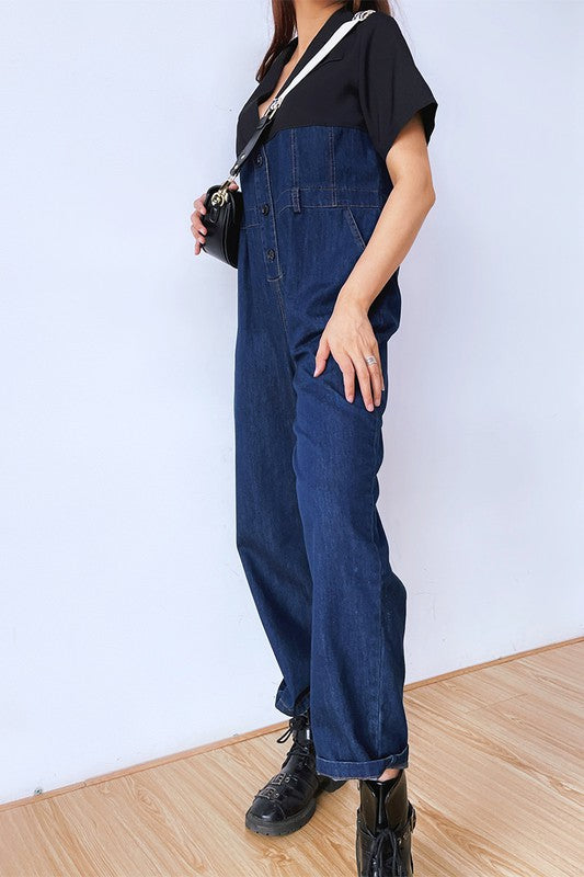 Short sleeve v-neck button down denim jumpsuit. Belt not included