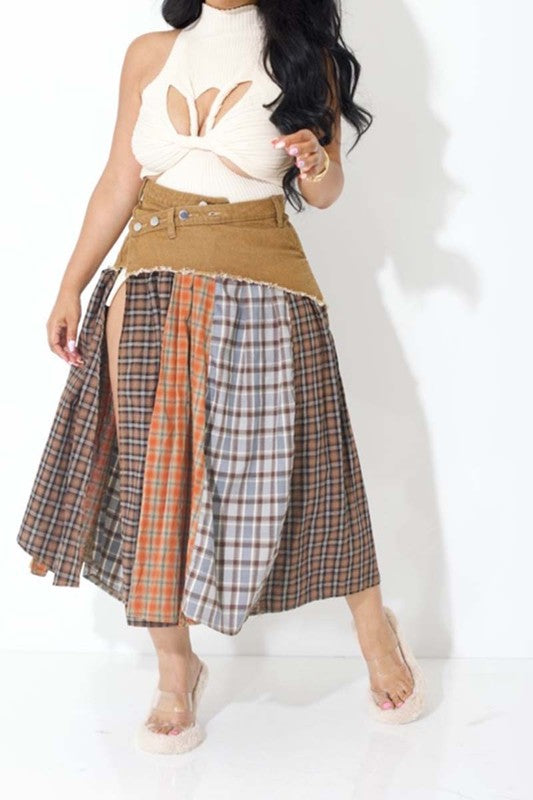 Add some flair to your wardrobe with our Plaid Open Split Skirt! The multi plaid pattern and open split design create a unique look, while the contrast fabric waist adds a touch of style. Perfect for standing out in a crowd.